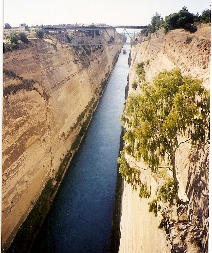 Asi v 17.30 si prohlížíme z mostu skutečně monumentální dílo – Korintský průplav. Průplav významně zkracuje vzdálenost mezi Jadranským a Egejským mořem. Dlouhý je přes 6 km, šířka asi 22 m, hloubka vody 8 m, a stěna se v nejvyšším místě tyčí 80 m nad vodní hladinou. Myšlenka postavit průplav vznikla již za císaře Nerona, ale kanál byl dokončen až na konci 19.st. Pořizujeme společnou fotku a v nedalekém obchůdku nakupujeme pohledy.