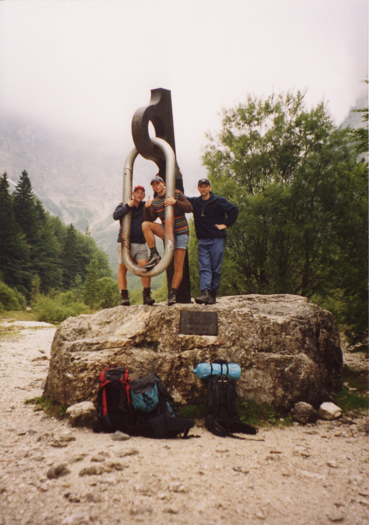 Praha-Žižkov – přijíždí Michal s krásným červeným golfem, ještě musíme dojet vyzvednout posledního borce – Pavla na Pražského povstání, jedeme opět po roce v osvědčené sestavě – Michal Schauhuber, Pavel Novotný, Petr Slapnička a já, tentokrát však s horolezeckým vybavením – přilby, sedáky, karabiny, den před odjezdem jsem byl na chirurgii, kde mi odstranili pár pih na obličeji a na krku, takže mám celej ksicht polepený náplastma, autíčko je slušně nacpaný, vyrážíme po dálnici a pak přes Tábor, Budějky až na rakouskou hranici v Dolním Dvořišti, čeští pohraničníci si zase hrajou na důležitý a nelíbí se jim můj pas, Rakušani nás pouští vcelku bez zdržování, v řízení se střídají Petr a Michal, takže se já s Pavlem můžeme věnovat gambáčům a jiným značkám, za hranicí jsou nepříjemné serpentýny, pak už luxusní dálnice směr Linz, Salzburg a Villach, valíme okolo 150 km/h, před půlnocí přichází brutální bouřka, kontrola na rakousko-slovinské hranici probíhá úplně bez problémů a zdržování, Pavel najednou dostává brutální močák, takže Petr rozjíždí rallye k prvnímu odpočívadlu – uff, Pavel to stihnul, venku už je slušná kosa, takže zase rychle skáčeme do auta a frčíme přes Jesenici, Mojstranu do údolí Vrata