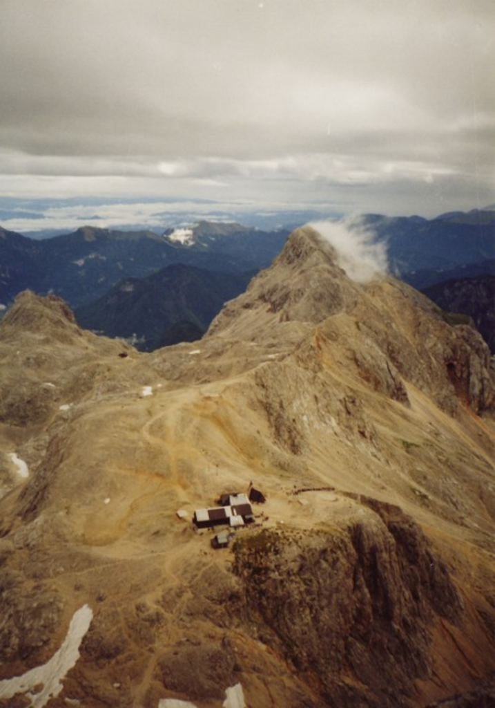 Triglavsky Dom – vstáváme okolo 06.00, venku je hnusně, přes noc sněžilo, pro dnešek máme 3 varianty: 1) podle plánu vylézt na Triglav a druhou stranou sestoupit do údolí Vrata zpět k autu, 2) nechat si na chatě batohy a nalehko vylézt na Triglav a vrátit se stejnou cestou k chatě a pak sestoupit přes Prag k autu do údolí Vrata, 3) okamžitý sestup přes Prag do údolí Vrata, nakonec se rozhodujeme, že zkusíme původní plán, tedy první variantu, 08.00 jsme připraveni vyrazit, sedáky, přilby a všechno ostatní máme na sobě, je mlha, fouká, poprchává, asi během 5-10 minut mlha ustupuje, přestává pršet, jsou vidět okolní hory, v dálce vidíme, jak slunce osvětluje vrcholy hor, nálada se zlepšuje, začíná největší hard core – skoro kolmý stoupák po skobách a lanech vzhůru k Triglavu, vrchol Triglavu je stále v mlze, ale čím více se k němu přibližujeme, tím více mraky mizí a objevuje se sluníčko, jdeme bez přestávek až na vrchol, po cestě je pár „uklidňujících“ tabulek se jmény lidí, kteří zde zahynuli (většinou za bouřky, jedna dívka pádem do údolí), dost fouká, nepříjemná pasáž, kdy na obě strany je kolmá stěna do propasti – naštěstí jsou zde ocelová lana (s námrazou), pak poslední kolmé stoupání a jsme na vrcholu,